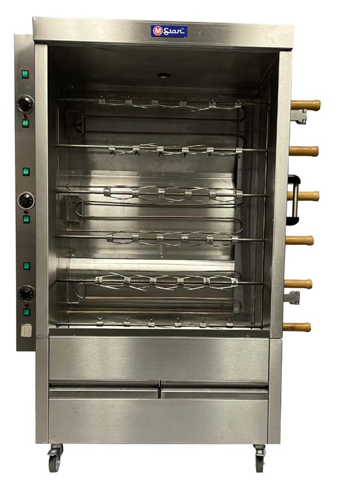 Asador de Pollos Eléctrico, compuesto por 6 Barras con capacidad de 5 pollos cada una, elaborado en acero Inoxidable con calidad de Exportación Diseñado para ser utilizado en cocinas de restaurantes, hoteles, casinos y otros lugares que se relacionen con la cocción de alimentos.