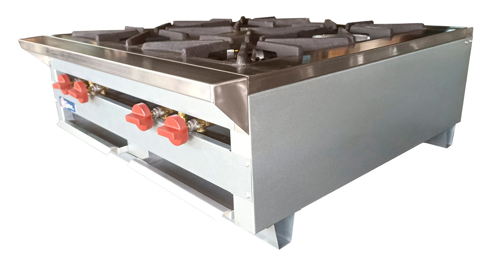 Cocina a gas en acero inoxidable 430 y estructura en galvanizado, compuesta por 4 hornillas de hierro fundido linea de Tope. Diseñada para ser utilizada en cocinas de restaurantes, hoteles, casinos y otros lugares que se relacionen con la cocción de alimentos.