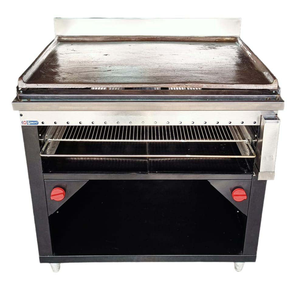 Plancha grande de piso a gas elaborada en galvanizado pintado, equipo diseñado especialmente para la cocción de alimentos a la plancha tales como huevo, hamburguesas, carnes, aves, pescados, mariscos por contacto directo de estos con la superficie caliente. Son recomendadas para cocinas de restaurantes, hoteles. casinos, locales de comida rápida y otros lugares relacionados con la cocción.