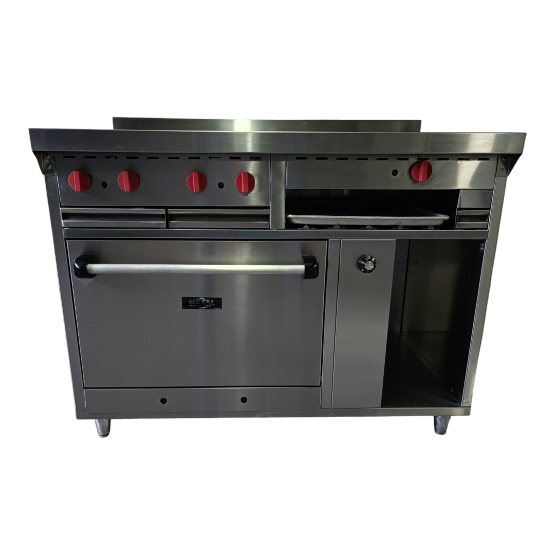 Cocina a gas resistente y versátil de acero inoxidable 430, compuesta por 4 hornillas de hierro fundido, una plancha con gratinador y un horno en acero aluminizado. Diseñada para ser utilizada en restaurantes, hoteles, y otros lugares que se relacionen con la cocción de alimentos. Se recomiendan para negocios que necesiten realizar varias operaciones distintas (Cocinar, Hornear y Colocar alimentos en la plancha).
