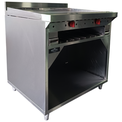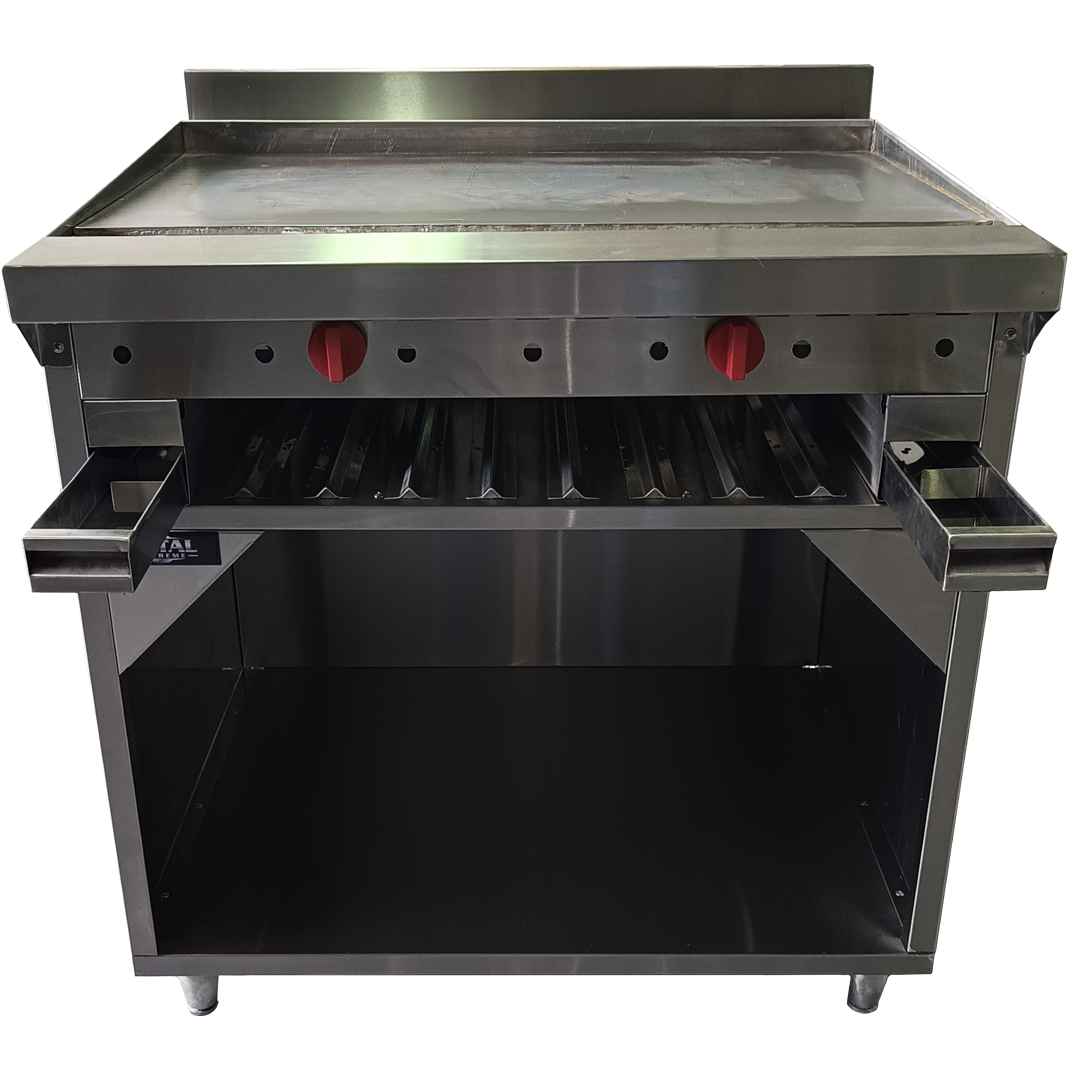 Plancha grande de piso a gas elaborada en acero inoxidable, equipo diseñado especialmente para la cocción de alimentos a la plancha tales como huevos, hamburguesas, carnes, pescados. Son recomendadas para cocinas de restaurantes, hoteles. casinos, locales de comida rápida y otros lugares relacionados con la cocción.
